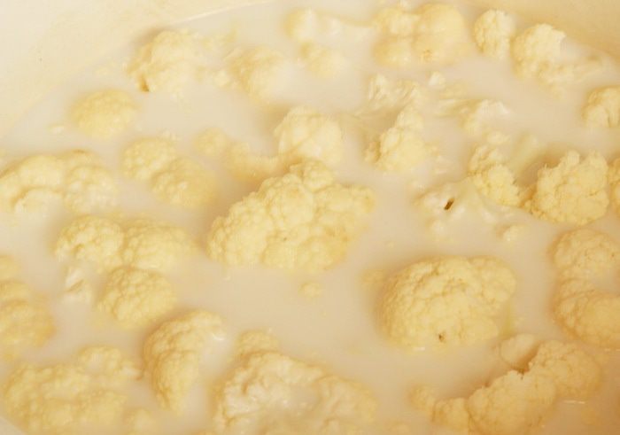 Вливаем в кастрюльку молоко и воду, разбираем капусту на соцветия и добавляем в кастрюльку. Ставим все на огонь. Доводим до кипения, убавляем огонь и под крышкой готовим 10 минут. Не забываем, что молоко может "сбежать"...