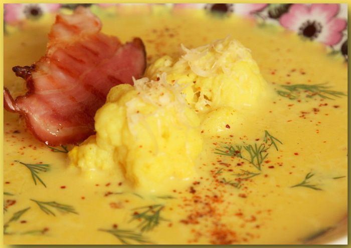 В тарелку наливаем суп-пюре, добавляем несколько соцветий отварной цветной капусты, подсушенный бекон, зелень, тертый сыр и совсем чуть-чуть паприки. Все - блюдо готово! Приглашайте всех к столу и - СМАЧНОГО!