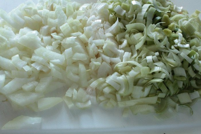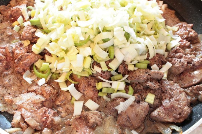 Добавить лук-порей, перемешать, прогреть 1-2 минуты (порей должен немного обмякнуть), добавить коньяк, помешивая, обжаривать еще минуты три, чтобы испарился алкоголь.