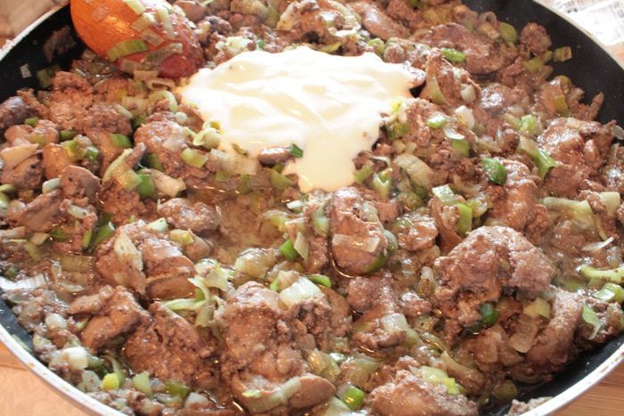 Обжарить на растительном масле репчатый лук до прозрачности, добавить печень и, помешивать в течении 3-4 минут. Печень должна поменять цвет, но оставаться мягкой и розовой внутри.