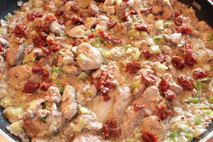 Нарезанные кусочками вяленые томаты, кусочек лаврового листа и, помешивая, тушить еще минут четыре-пять, выключить огонь, накрыть крышкой и дать блюду немного настояться.