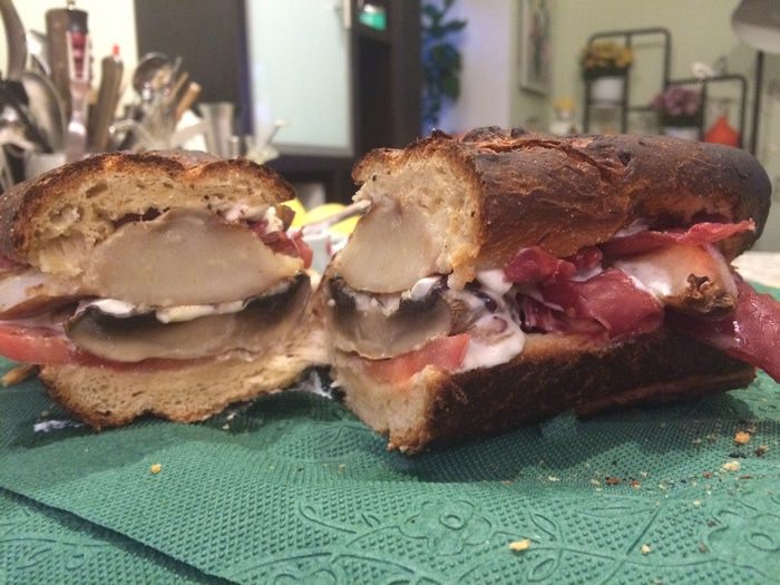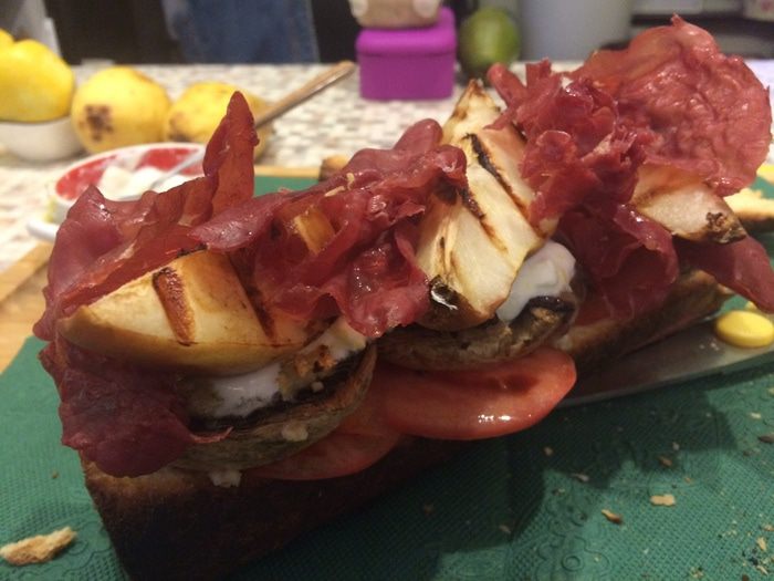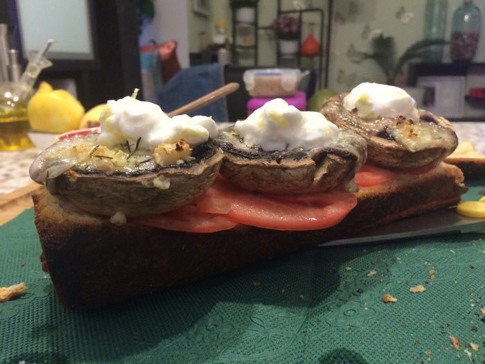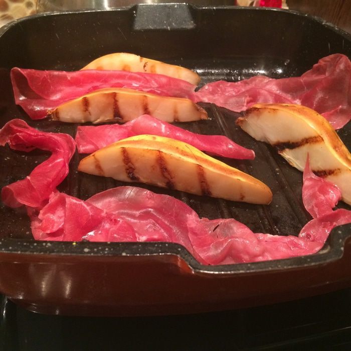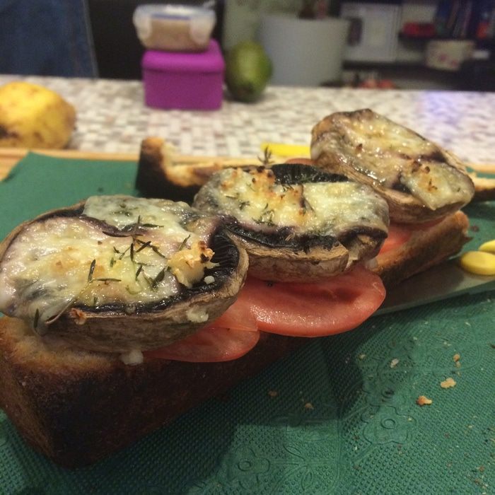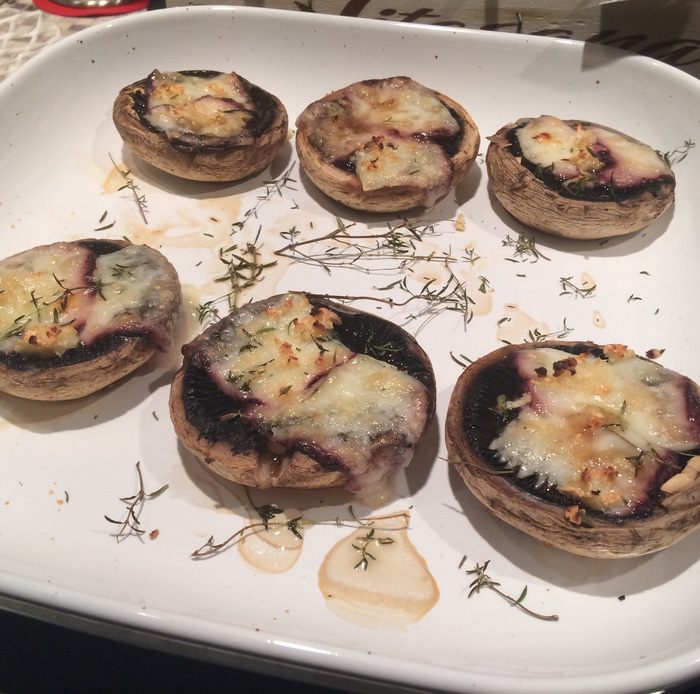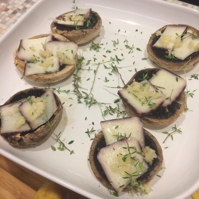 Ставим гриб на бок и срезаем ему ножку, захватывая 1-2 мм от края шляпки, чтобы получился очень ровный кругляшок. Без масла на разогретой сухой сковороде-гриль подсушиваем все грибы по 3 мин с каждой стороны. (Не теряем время - чистим чеснок, снимаем листочки с веток тимьяна, режем груши на 4 части). Подсушенные шляпки перекладываем в жаропрочную форму, приправляем солью, перцем, укладываем по 2-3 тонких ломтика сыра, присыпаем листика тимьяна и выдавливаем на каждую шляпку немного чеснока.