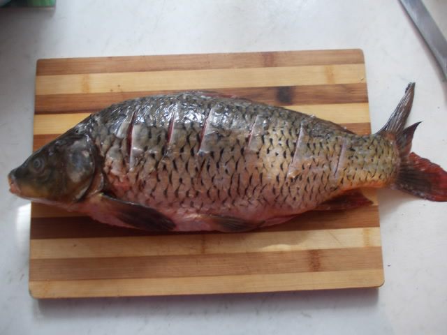 Карпа почистить хорошо,вымыть и высушить полотенцем. Сделать надрезы вдоль, не очень глубокие. Посолить и поперчить, я использую для рыбы специальную специю, лимонный перец, очень здорово подходит.