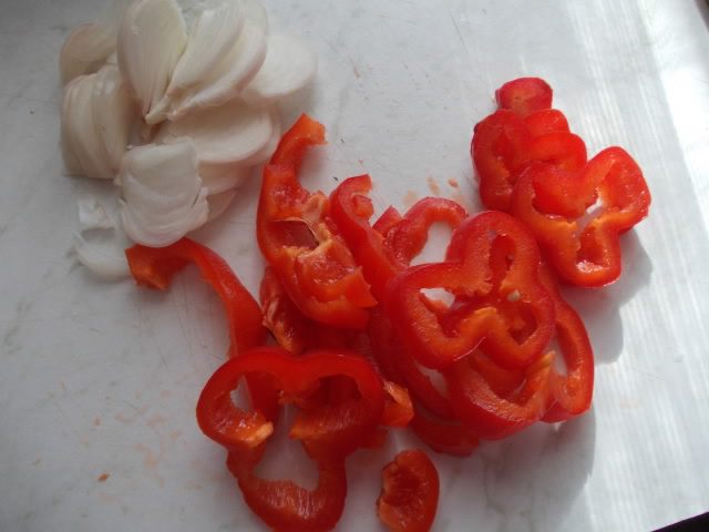 Фаршируем ее нашей овощной начинкой. А разрезы шпигуем маслом с чесноком, остальное просто укладываем сверху.