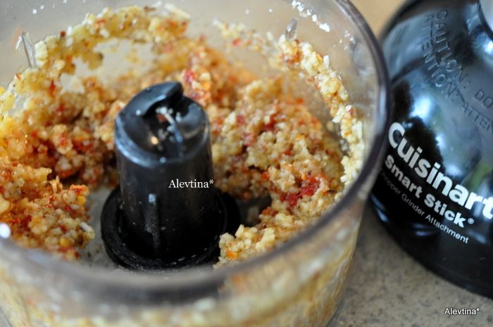 В кухонном процессоре в крупную крошку рубим: орехи, пармезан, чеснок, помидоры вяленые. Добавляем соль, розмарин, черный перец и перемешиваем.