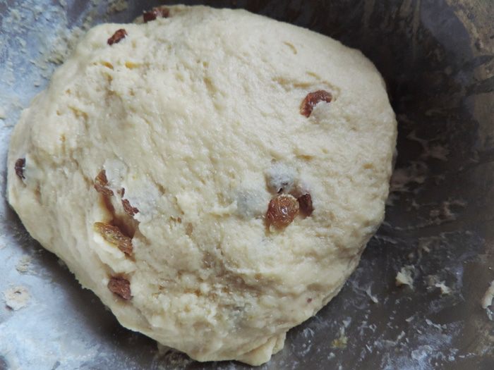 Итак, соединяем в миске все ингредиенты, кроме изюма и повидла. Замешиваем мягкое тесто. По желанию добавляем промытый и просушенный изюм. Вымешиваем, чтоб он равномерно распределился по тесту.