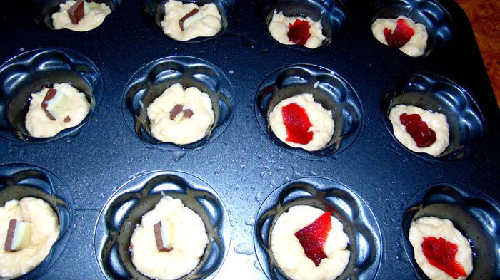После кладем в серединку любую начинку. У меня было 6 штучек с шоколадом и 6 с повидлом.