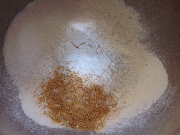 Соединить в миске муку, сахар, разрыхлитель, имбирь, соду и щепотку соли. Все хорошо перемешать.