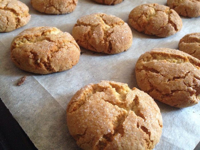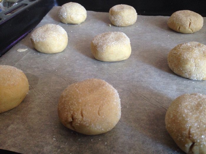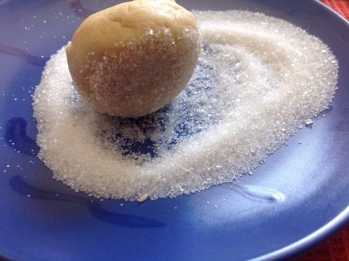 Из теста сформировать шарики размером с грецкий орех, обвалять хорошо в сахаре и выложить на противень, застеленный бумагой для выпечки, на расстоянии 5 см. друг от друга (это важно!). Каждый шарик чуть придавить!