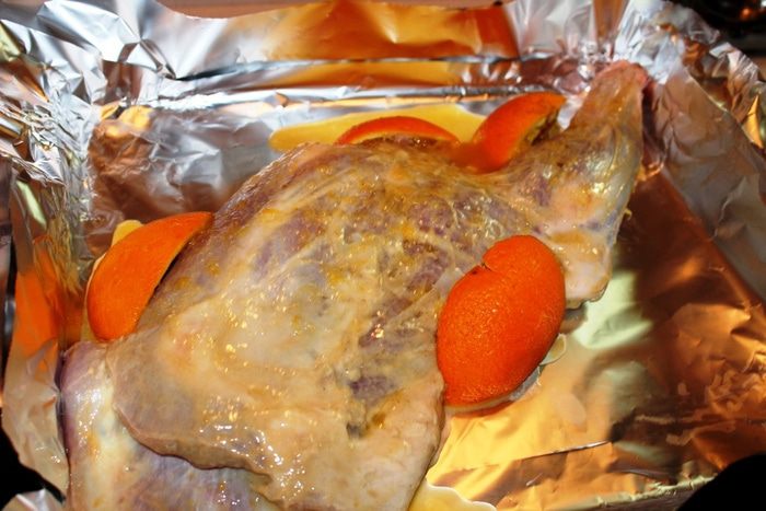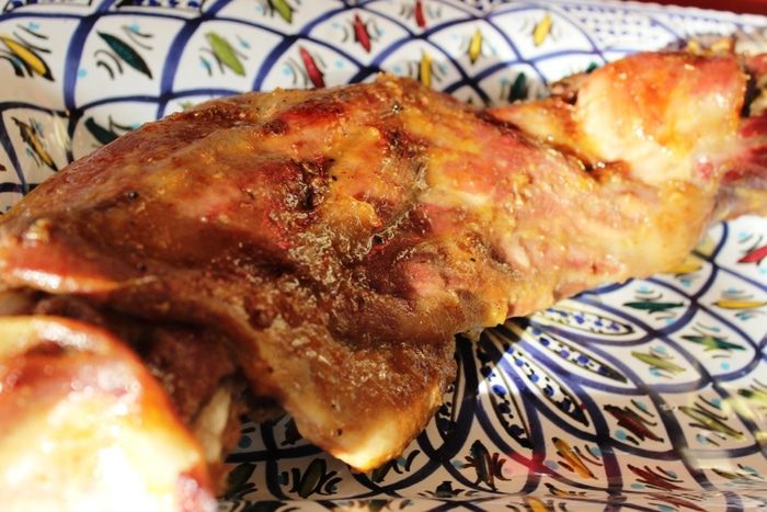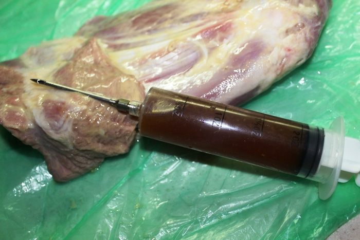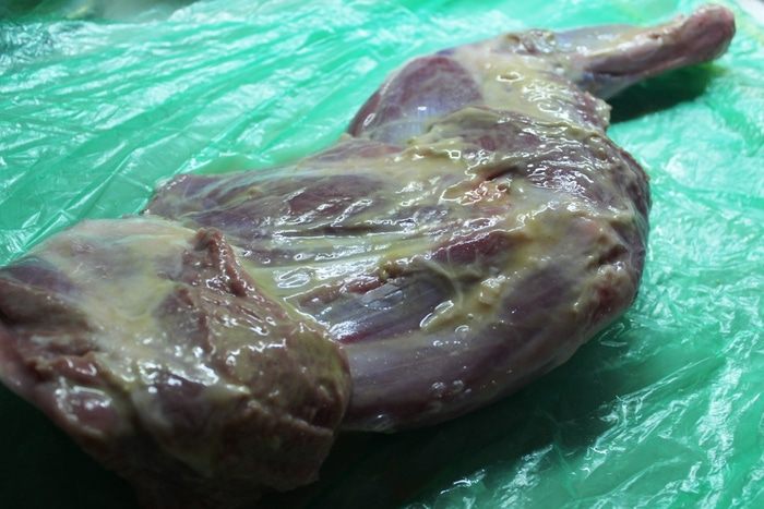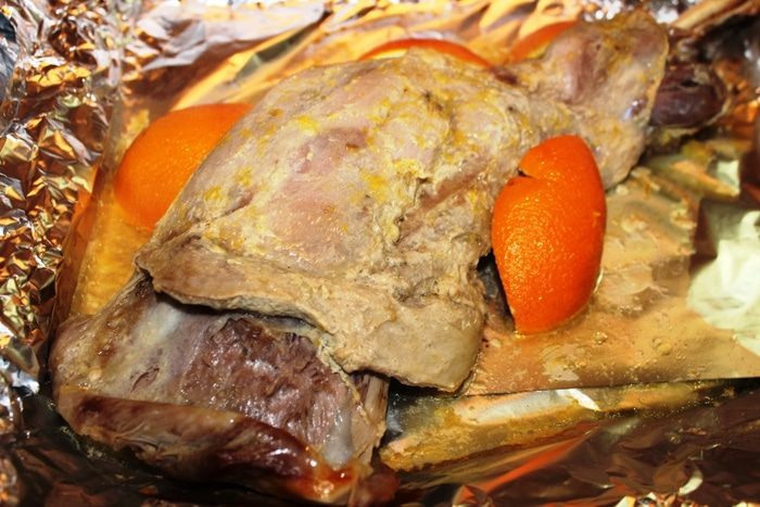 Для маринада смешать сок половины апельсина, соевый соус и 1 ложку меда, разбавленного горячей водой. Наполнить этим маринадом специальный кулинарный шприц для мяса и наколоть баранью ногу со всех сторон. Следует помнить, что при накачивании ноги маринадом необходимо немного массировать мышцы, чтобы он не выливался обратно из проделанного иглой отверстия