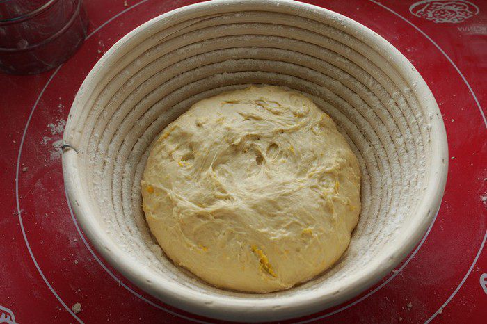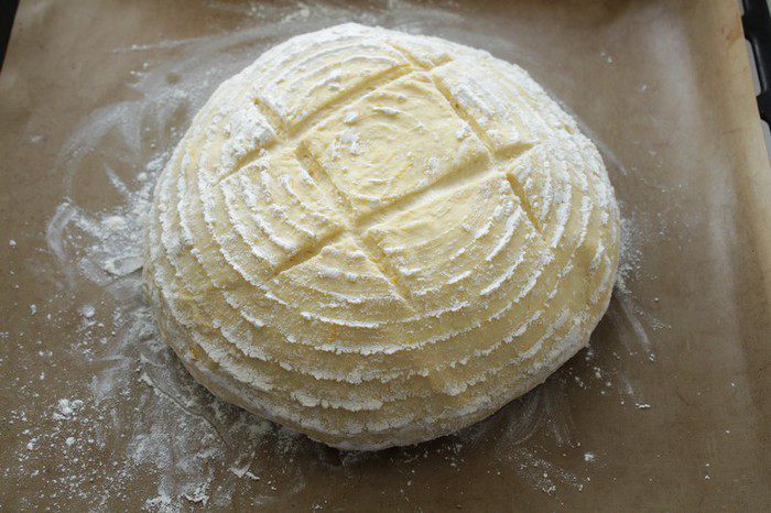 Если у вас нет расстоечной корзинки,сформируйте хлеб, выложите на посыпанный мукой противень, посыпьте сверху мукой и поставьте подходить в течение 30 - 40 минут.( Я выложила тесто в корзинку.)