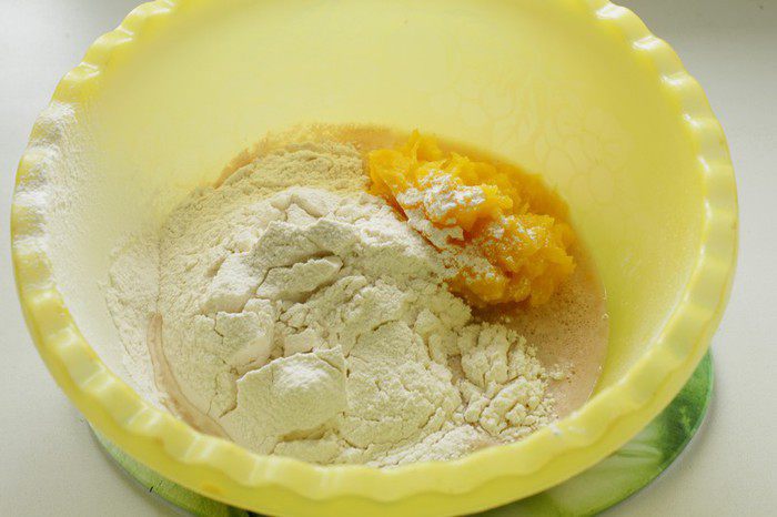 В дрожжевую смесь добавить тыквенное пюре.(Запечь в микре без воды)