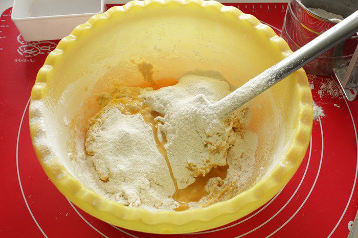 Частями просеять муку,