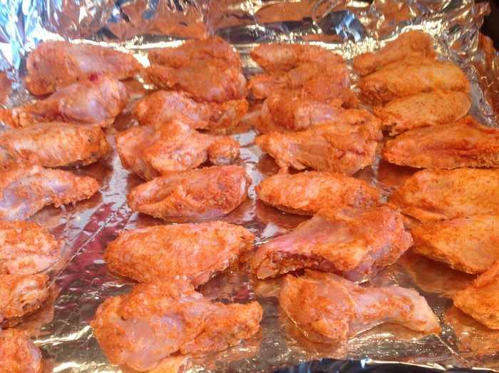 Выложите крылышки на противень застеленный фольгой и смазанный растительным маслом. Поставьте в духовку на 20 минут.