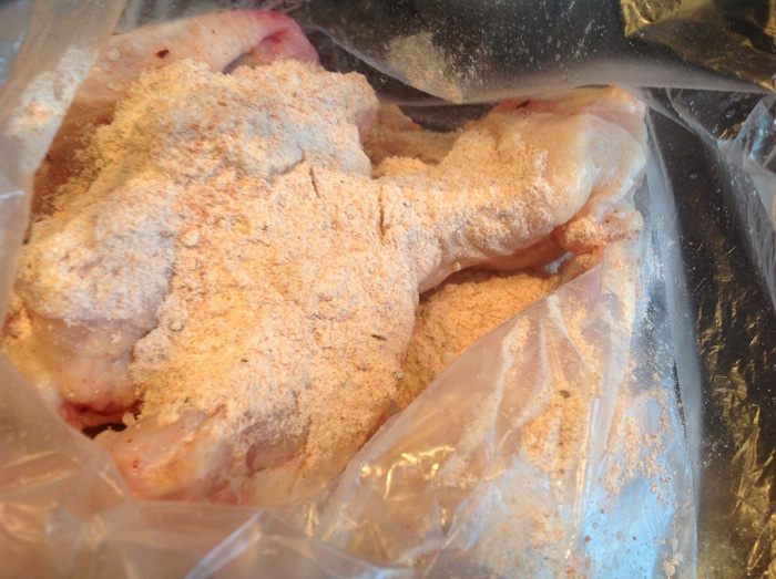 Положите куриные крылышки, в кулек сверху высыпьте сухую смесь и хорошо перемешайте.