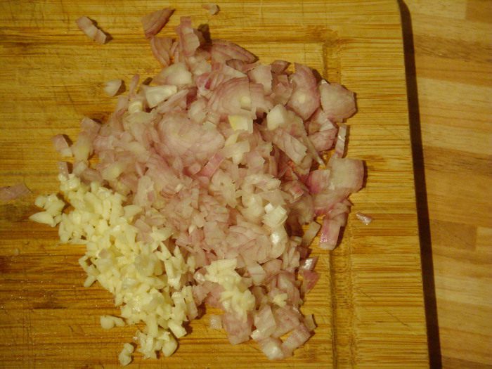 Начнем с чатни: порубим мелко лук, чеснок, кусочек имбиря.