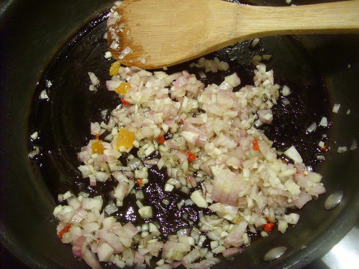 Пассеровать на разогретом масле (любом) начинаем с лука, затем добавляем имбирь, чеснок.