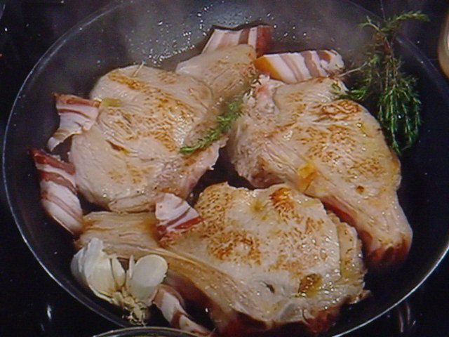 Обжарить на разогретом масле с обоих сторон, можно в сковородку добавить любимые травки, чеснок прямо в шелухе ( помыть!) и копченое сало. Все это придаст мясу аромат.