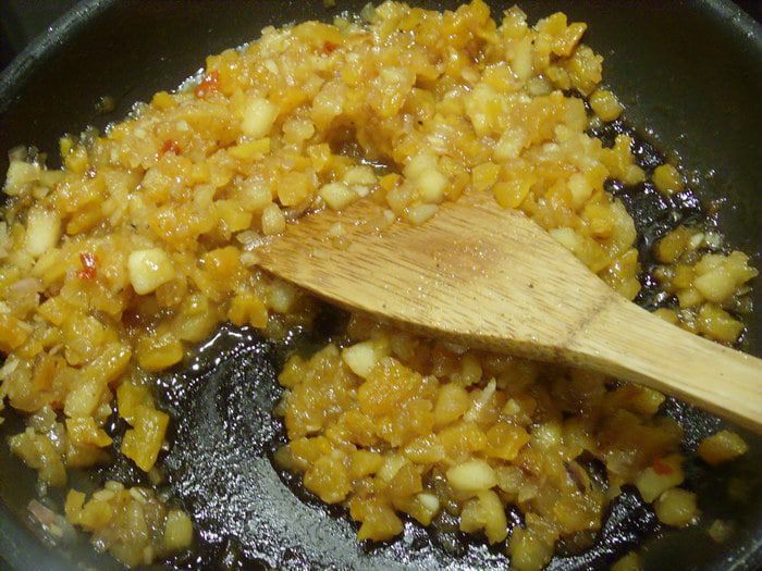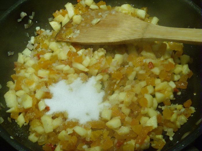Затем яблоко, курагу, чили. Тушить на среднем огне, добавляем сахар, соль.