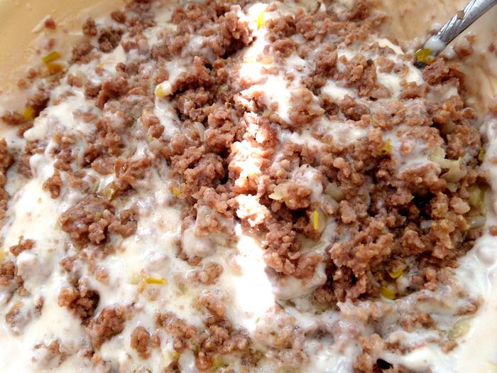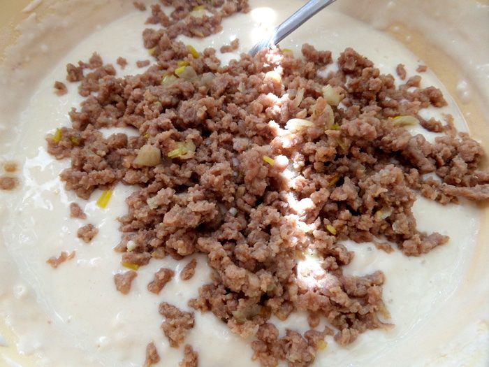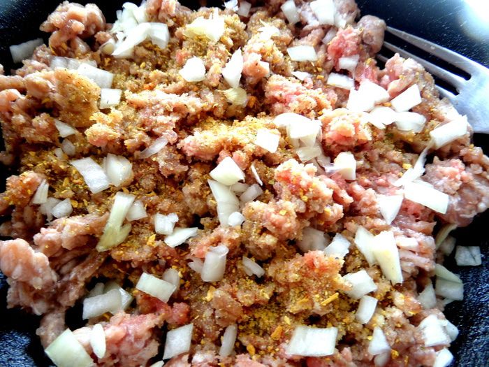 В это время обжариваем фарш (у меня говяжий) с луком и приправами...Фарш при этом разминаем вилкой в мелкую крупинку.