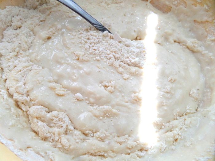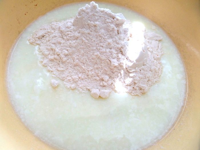 Всыпать муку с разрыхлителем (можно соду-0.5 ч.л.).