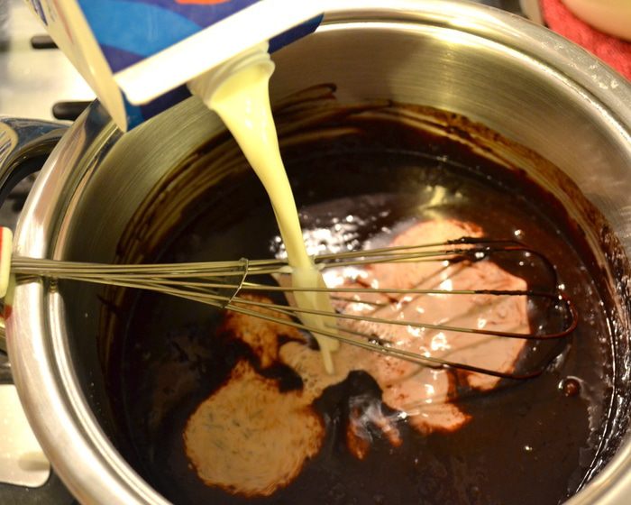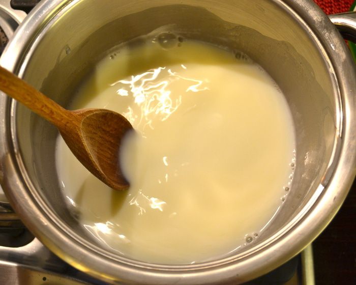 ...и оставшееся молоко. Поставить кастрюльку снова на огонь. Как следует размешать, чтобы не было комочков.