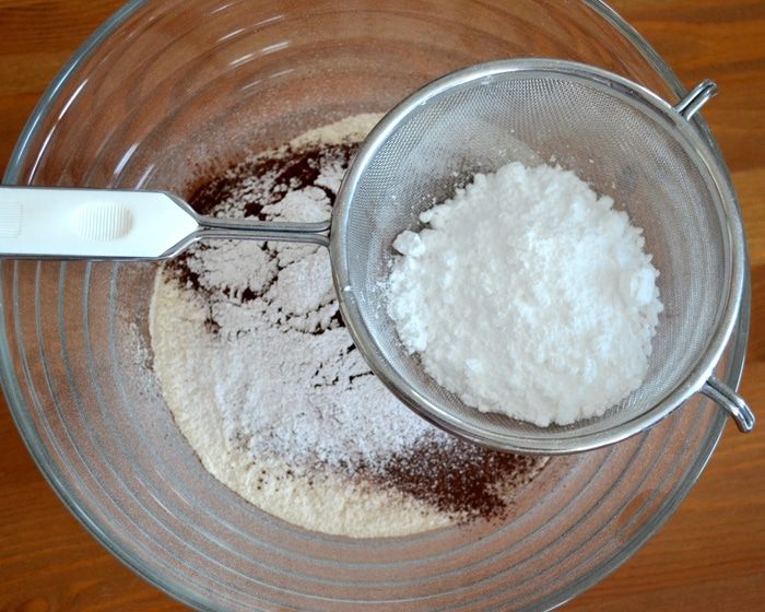 Для шоколадного теста просеять и смешать между собой муку, какао-порошок и сахарную пудру.