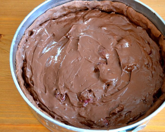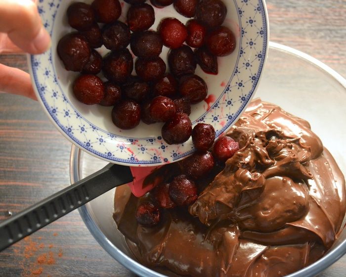 В остывший крем добавить размороженную вишню. Перемешать и убрать в холодильник, накрыв миску с кремом пищевой пленкой в контакте с поверхностью крема.