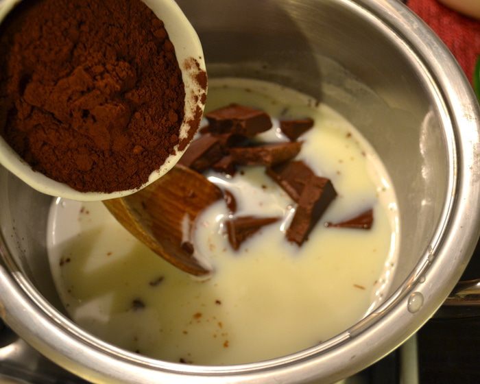 Снять с огня и добавить шоколад, поломанный на кусочки, какао порошок...