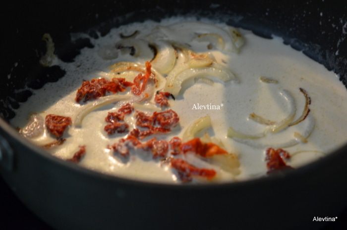 Обжарить лук на оливковом масле 2-3 мин, затем добавить порубленный мелко чеснок и готовить 1 мин. Затем добавить не густые сливки 250 мл, вяленые томаты порезанные.