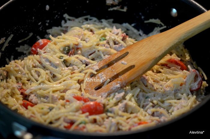 Добавим тунец, зеленый горошек, 1/2 стакана черри томаты порезанные напополам, приготовленную пасту и перемешаем, каперсы.