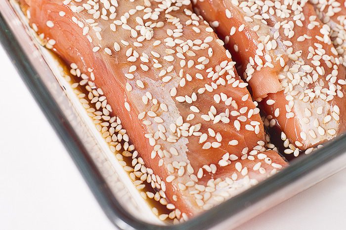 Выкладываем в форму для приготовления, заливаем приготовленным маринадом и посыпаем сверху кунжутом. Оставляем мариноваться на 20 минут.