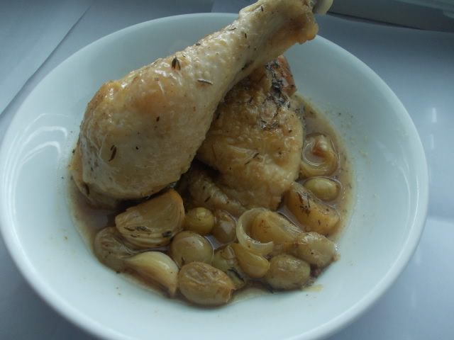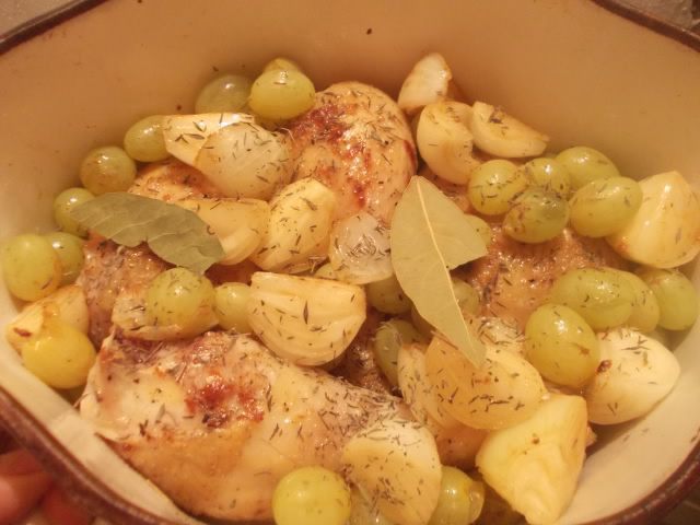 Виноград,вместе со всем остальным из сковороды,отправляем к курице. Присыпем тимьяном,добавим лавровый лист,накроем сверху фольгой или крышкой и отправим в духовку на часик при 180 градусах.