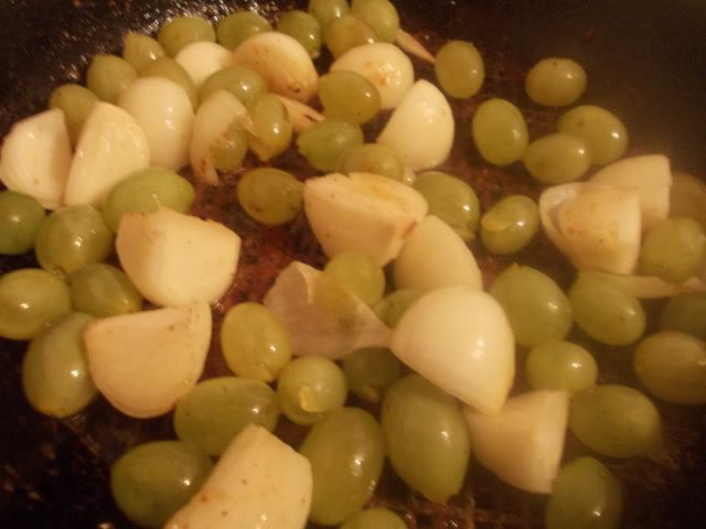 На сковороде, в масле и соке, который остался после курицы, протушиваем виноград с луком,собираем соки так сказать. Через пару минут,выливаем туда вино,подождем пока закипит и выключаем плиту.