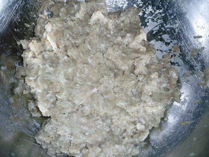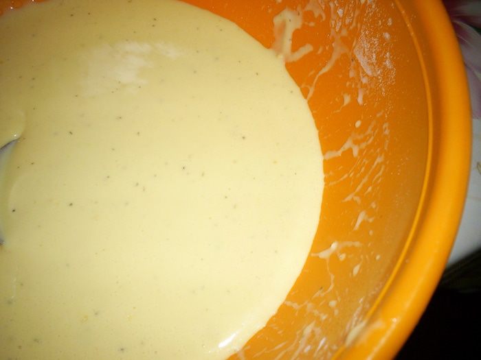 Теперь вливаем полстакана молока и высыпаем всю муку. Ложки набираем с большой горкой! Перемешиваем тесто и постепенно доливаем остальное молоко. Так мы поступаем, чтоб не образовывались комочки. Тесто по консистенции - как густая сметана.