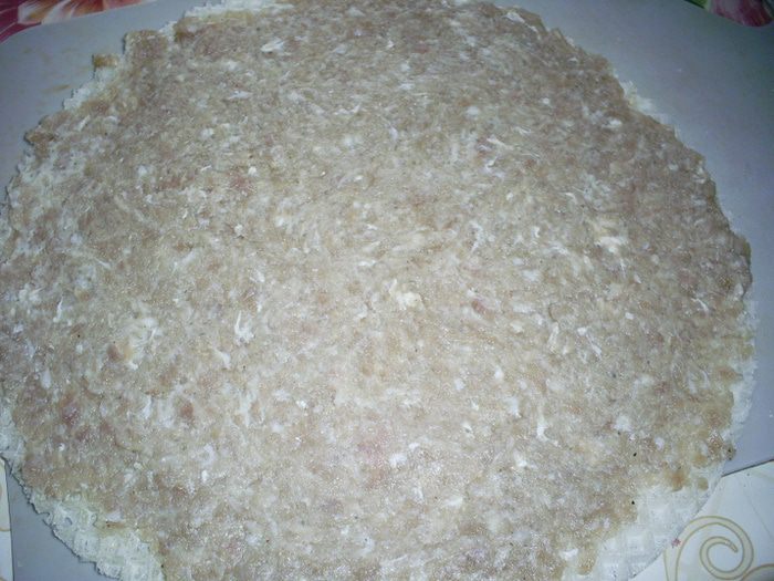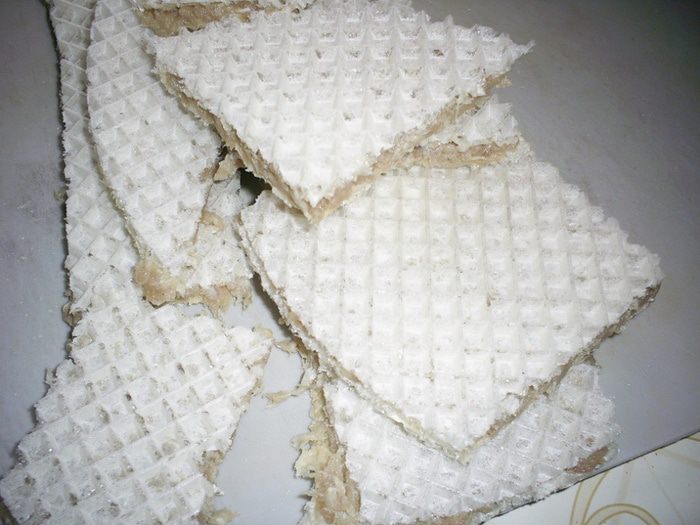 Далее нам понадобятся готовые листовые вафли. Они бываю разных форм и размеров, так что количество условно. берем один вафельный пласт, намазываем его фаршем толщиной 0,5см. Больше не надо, а то есть возможность его потом недожарить)