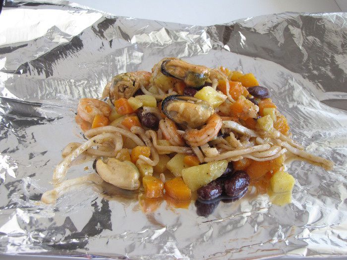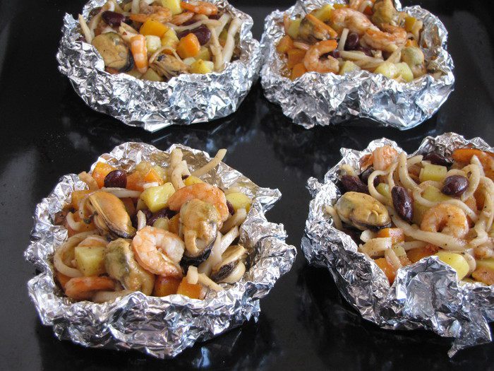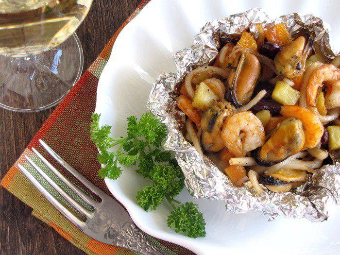 Разогреть на сковороде сливочное масло. Добавить мелко рубленный чеснок, слегка обжарить. Подготовленные продукты немного притушить в сливочном масле все вместе и разом. Добавить вино и сливки, посолить по вкусу. Немного выпарить жидкость и снять с огня.