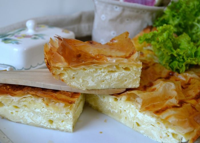 Когда вся начинка закончится, накрыть пирог сверху сухим листом (или двумя!) теста фило и завернуть свисающие края к центру, чтобы начинка не вытекала в процессе выпечки. Смазать верх пирога яйцом и поставить выпекаться в разогретую духовку на 50 минут, до приобретения пирогом золотистого цвета.