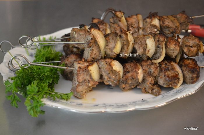 Нанизываем на шампуры, готовим на костре или в разогретой духовке на 200 гр., или на гриле до готовности.