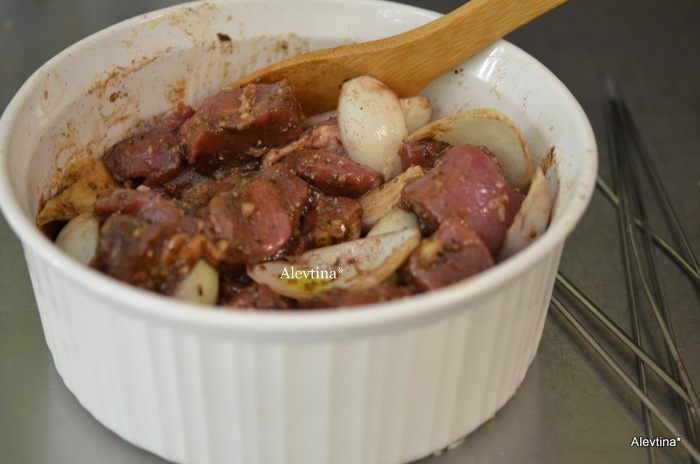 Луковицу порезать крупно на дольки, выложить в свинину посолить и поперчить, залить красным вином и оливковым маслом. Перемешать, закрыть пленкой и поставить в холодильник на 4-6 час. или ночь.
