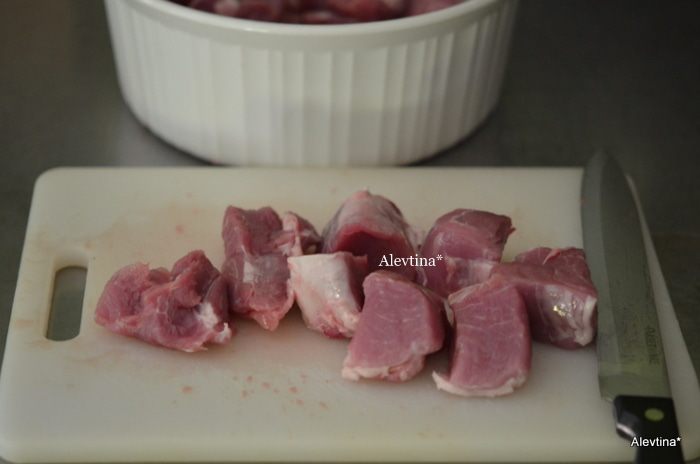 Приготовить все для шашлыка. Свинину порезать крупными кубиками.