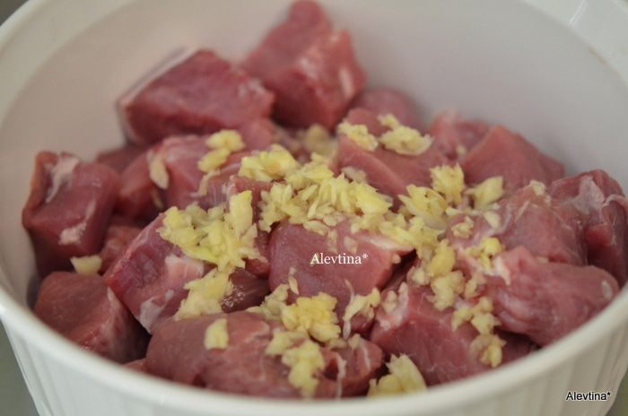 Выложить в глубокую емкость, чеснок порубить мелко, выложить поверх свинины.