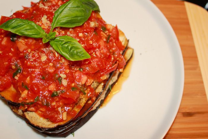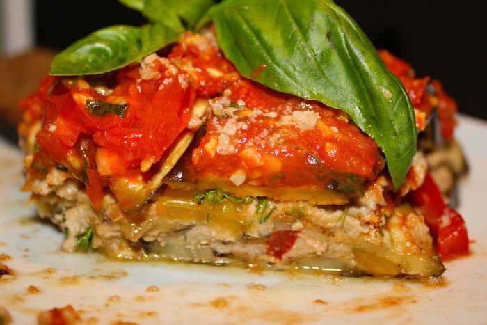 У меня получилось 3 слоя. Сверху поливаем тушенными томатами и украшаем веточкой базилика.
