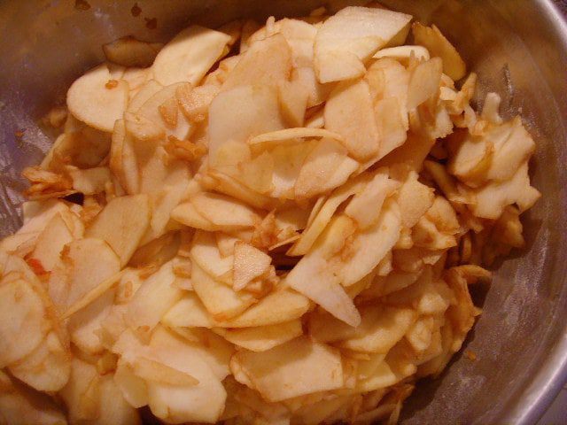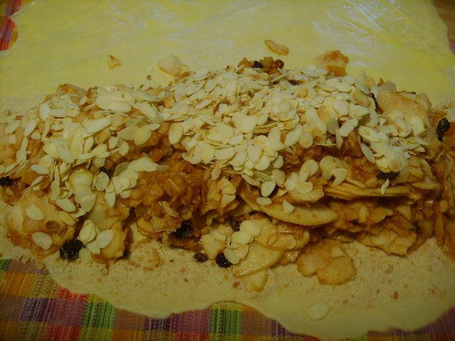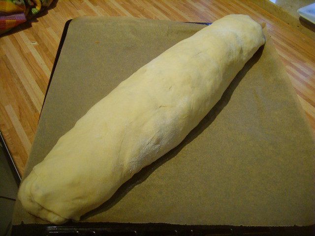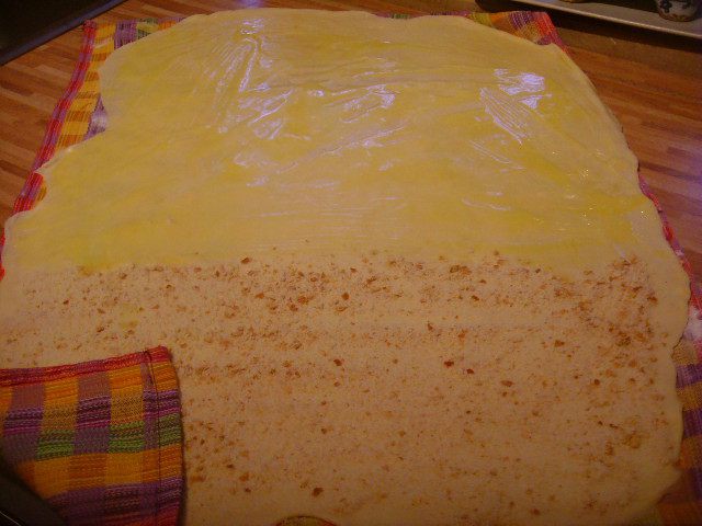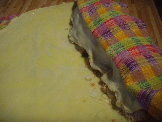 Тесто может находиться в холодильнике до тех пор, когда вы захотите с ним дальше работать. Я говорю это к тому, что штрудель очень вкусно есть в тёплом виде с ванильным соусом или шариком мороженого. За час до начала работы с тестом его нужно вынуть из холодильника. Кухонное полотенце посыпать мукой. Растопить масло, добавить в него ванильный экстракт. Тесто раскатать очень тонко, при необходимость его растягивает руками.