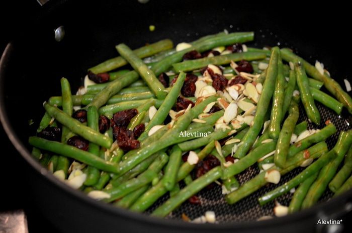 На горячую сквороду вылить оливковое масло, затем орехи и клюкву сушеную. Добавить фасоль, посолить и поперчить. Перемешать.