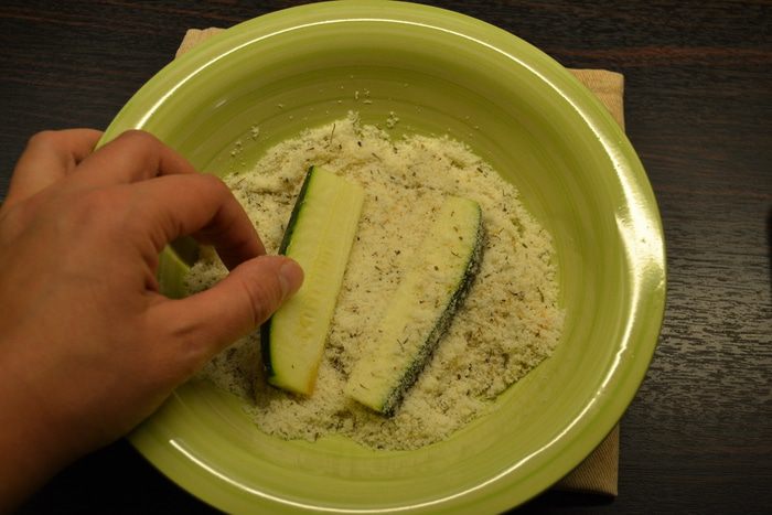 Противень застелить пекарской бумагой. Брусочки цукини обвалять в полученной смеси. По рецепту предлагается просто выложить цукини на противень и присыпать сверху, но, мне кажется, что таким образом они более равномерно покрываются ароматной смесью.