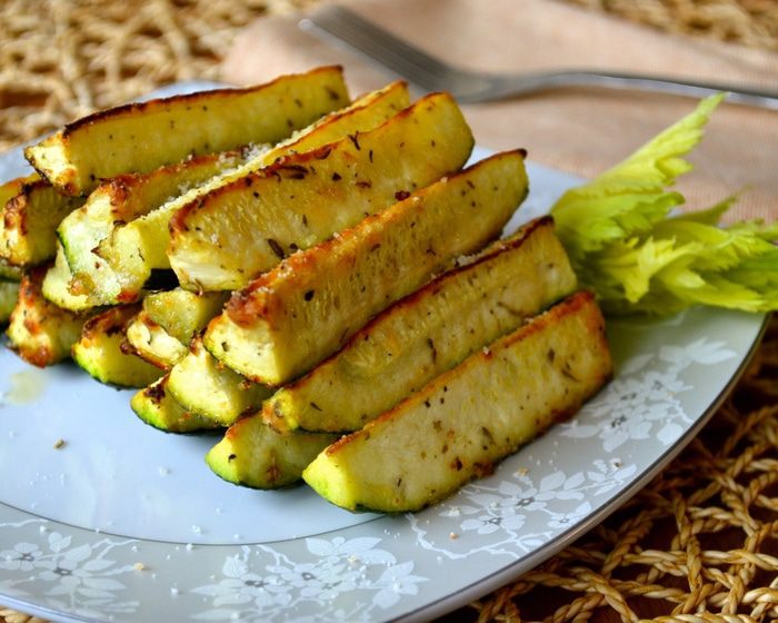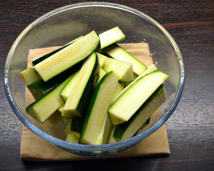 Выложить брусочки цукини на подготовленный противень. Слегка сбызнуть оливковым маслом. Выпекать 20 минут в разогретой духовке. Последние 2-3 минуты поставить под включенный гриль.