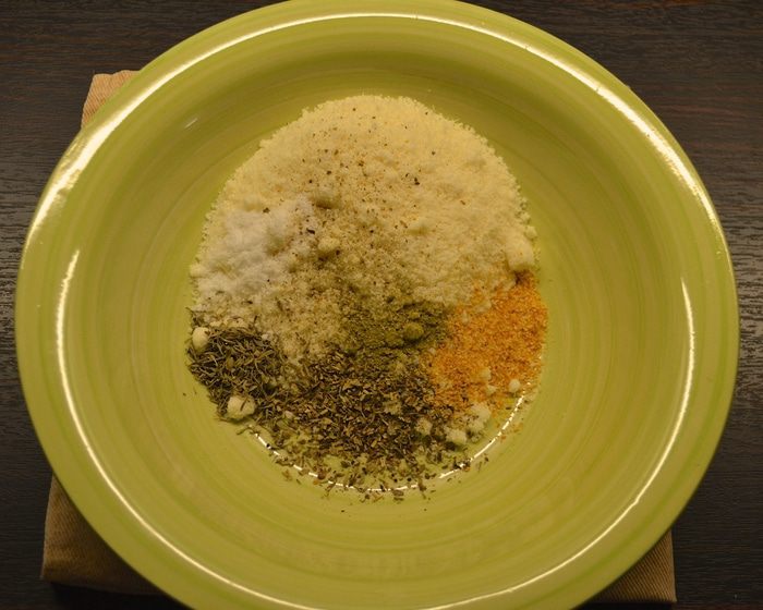 В миске смешать между собой тертый сыр пармезан, все специи, соль и перец.