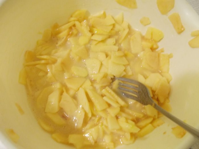 Яблоки почистить от кожуры, вырезать внутренность. Поделить на 8 частей и тонко нарезать.
