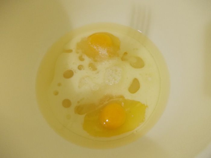 В миску выливаем подсолнечное масло, молоко, 2 яйца и высыпаем сахар. Все перемешиваем.